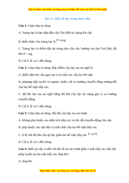 Đây là bản xem th , vu ử i lòng mua tài li u ệ đ xe ể m chi ti t ế (có l i ờ gi i ả ) Bài 11. M t ộ số l c t ự rong th c t ự i n ễ Câu 1: Ch n ọ đáp án đúng A. Tr ng l ọ c l ự à l c h ự p d ấ n c ẫ a ủ Trái Đ t ấ tác d ng l ụ ên v t ậ . B. Bi u ể th c c ứ a t ủ r ng l ọ c l ự à P m .g C. Tr ng ọ l c ự có đi m ể đ t ặ t i ạ tr ng ọ tâm c a ủ v t ậ , hư ng ớ vào tâm Trái Đ t ấ , độ l n P ớ = mg.