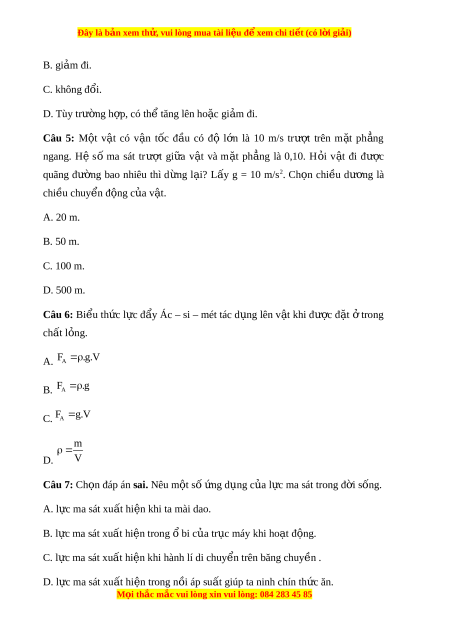 Đây là bản xem th , vu ử i lòng mua tài li u ệ đ xe ể m chi ti t (c ế ó l i ờ gi i ả ) B. gi m ả đi. C. không đôi. D. Tùy trư ng h ờ p, ợ có th t ể ăng lên ho c ặ gi m ả đi. Câu 5: M t ộ v t ậ có v n ậ t c ố đ u â có độ l n ớ là 10 m/s trư t ợ trên m t ặ ph ng ẳ ngang. H ệ s ố ma sát trư t ợ gi a ữ v t ậ và m t ặ ph ng ẳ là 0,10. H i o v t ậ đi đư c ợ quang đư ng ờ bao nhiêu thi d ng ư l i ạ ? L y ấ g = 10 m/s2. Ch n ọ chi u ề dư ng ơ là chi u ề chuy n đ ể ng c ộ a ủ v t ậ . A. 20 m. B. 50 m. C. 100 m. D. 500 m. Câu 6: Bi u ể th c ứ l c ự đ y