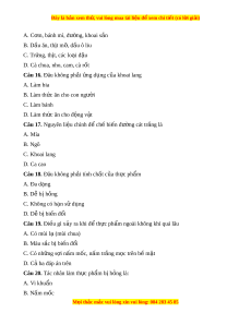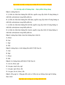Đây là bản xem th , vu ử i lòng mua tài li u ệ đ xe ể m chi ti t (c ế ó l i ờ gi i ả ) E.4. bài t p m ậ t ộ s l ố ư ng t ơ h c – t ự h c p ự h m ẩ thông d ng ụ Câu 1. Lư ng t ơ h c l ự à: A. Là th c ăn ch ứ a ứ hàm lư ng l ợ n ch ớ t ấ béo, ngu n cung c ồ p chí ấ nh v năng ề lư ng và ợ chất b t ộ carbohydrate trong kh u ph ẩ n ăn. ầ B. Là th c ứ ăn ch a hàm ứ lư ng ợ l n ch ớ t ấ đ m ạ , ngu n cung c ồ p chí ấ nh v năng l ề ư ng ợ và chất b t ộ carbohydrate trong kh u ph ẩ n ăn. ầ C. Là th c ứ ăn ch a hàm ứ lư ng ợ l n t ớ inh b t ộ , ngu n cung c ồ p chí ấ nh v năng l ề ư ng và ợ chất b t ộ carbohydrate trong kh u ph ẩ n ăn. ầ D. Là th c ăn ch ứ a ứ hàm lư ng l ợ n vi ớ tamin, ngu n cung c ồ p chí ấ nh v năng l ề ư ng ợ và chất b t ộ carbohydrate trong kh u ph ẩ n ăn. ầ Câu 2. Lư ng t ơ h c đ ự ược ch n l ọ àm lư ng ơ th c chí ự nh là: A. Khoai B. G o ạ C. Ngô D. S n ắ Câu 3. Lư ng t ơ h c có ự s n ả lư ng l ợ n nh ớ t ấ ở Vi t ệ Nam là: A. G o ạ B. Ngô C. Khoai D. S n ắ Câu 4. Các lư ng t ơ h c ự ph bi ổ n ế ở Vi t ệ Nam là A. Lúa mì, khoai, ngô B. Lúa g o, ạ m ch ạ nha, ngô C. Lúa g o, ạ ngô, khoai, s n ắ D. Lúa g o, l ạ úa mì, khoai, s n ắ