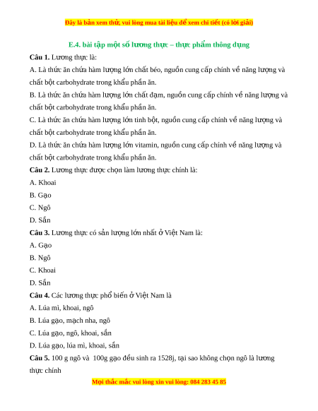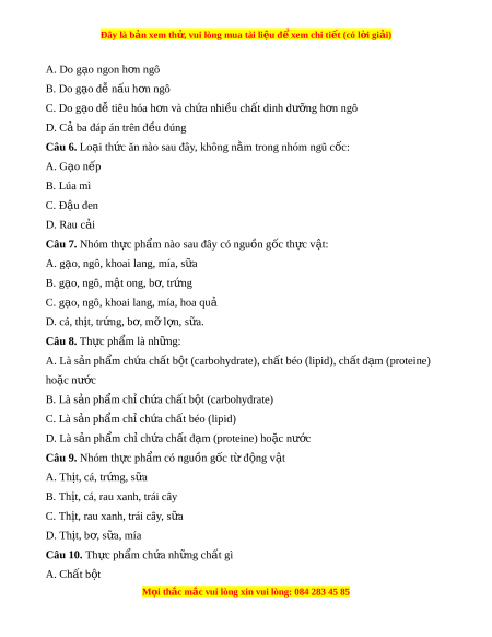 Đây là bản xem th , vu ử i lòng mua tài li u ệ đ xe ể m chi ti t (c ế ó l i ờ gi i ả ) A. Do g o ạ ngon h n ngô ơ B. Do g o d ạ ễ nấu h n ơ ngô C. Do g o d ạ ễ tiêu hóa h n và ch ơ a ứ nhi u ch ề t ấ dinh dư ng ỡ h n ngô ơ D. C ba đáp ả án trên đ u ề đúng Câu 6. Lo i ạ th c ăn ứ nào sau đây, không n m ằ trong nhóm ngũ c c: ố A. G o ạ n p ế B. Lúa mì C. Đ u đen ậ D. Rau c i ả Câu 7. Nhóm th c ự ph m ẩ nào sau đây có ngu n g ồ c t ố h c v ự t ậ : A. g o,