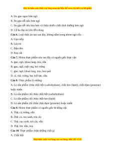 ạ ngô, khoai lang, mía, s a ữ B. g o, ngô, m ạ t ậ ong, b , t ơ r ng ứ C. g o, ngô, khoai ạ lang, mía, hoa quả D. cá, th t ị , tr ng, b ứ , m ơ l ỡ n, s ợ a. ữ Câu 8. Th c ph ự m ẩ là nh ng: ữ A. Là s n ả ph m ẩ ch a ch ứ t ấ b t ộ (carbohydrate), ch t ấ béo (lipid), ch t ấ đ m ạ (proteine) ho c ặ nư c ớ B. Là s n ph ả ẩm chỉ ch a ứ ch t ấ b t ộ (carbohydrate) C. Là s n ph ả ẩm chỉ ch a ứ ch t ấ béo (lipid) D. Là s n ả ph m ẩ ch ch ỉ a ch ứ t ấ đ m ạ (proteine) ho c ặ nư c ớ Câu 9. Nhóm th c ự ph m ẩ có ngu n g ồ c t ố đ ừ ng v ộ t ậ A. Th t ị , cá, tr ng, s ứ a ữ