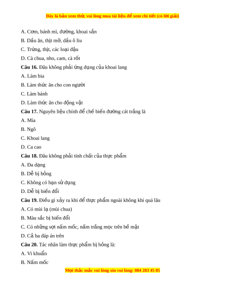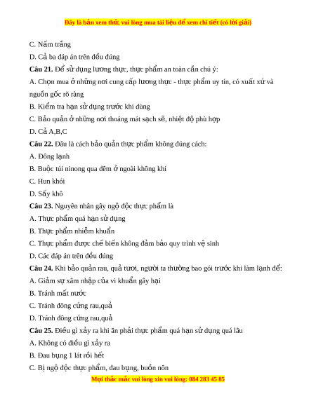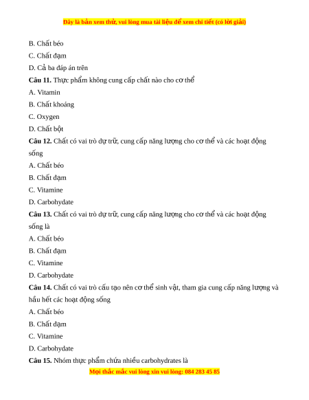 Đây là bản xem th , vu ử i lòng mua tài li u ệ đ xe ể m chi ti t (c ế ó l i ờ gi i ả ) B. Chất béo C. Chất đ m ạ D. C ba đáp ả án trên Câu 11. Th c ự ph m ẩ không cung c p ch ấ t ấ nào cho c t ơ hể A. Vitamin B. Chất khoáng C. Oxygen D. Chất b t ộ
