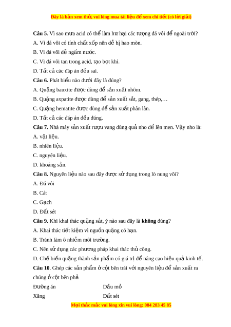 Đây là bản xem th , vu ử i lòng mua tài li u ệ đ xe ể m chi ti t ế (có l i ờ gi i ả ) Câu 5. Vì sao m a aci ư d có th l ể àm h h ư i ạ các tư ng đá vôi ợ đ ngoài ể tr i ờ ?