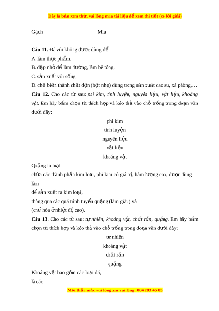 ắ , ý nào sau đây là không đúng? A. Khai thác ti t ế ki m ệ vì ngu n qu ồ ng ặ có h n. ạ B. Tránh làm ô nhi m ễ môi trư ng. ờ C. Nên s d ử ng các ụ phư ng pháp khai ơ thác th công. ủ D. Ch bi ế n qu ế ng ặ thành s n ph ả m ẩ có giá tr đ ị nâng ể cao hi u qu ệ ki ả nh t . ế Câu 10. Ghép các s n ả ph m ẩ c ở t ộ bên trái v i ớ nguyên li u đ ệ s ể n ả xu t ấ ra chúng c ở t ộ bên phả Đư ng ăn ờ Dầu mỏ Xăng Đất sét M i