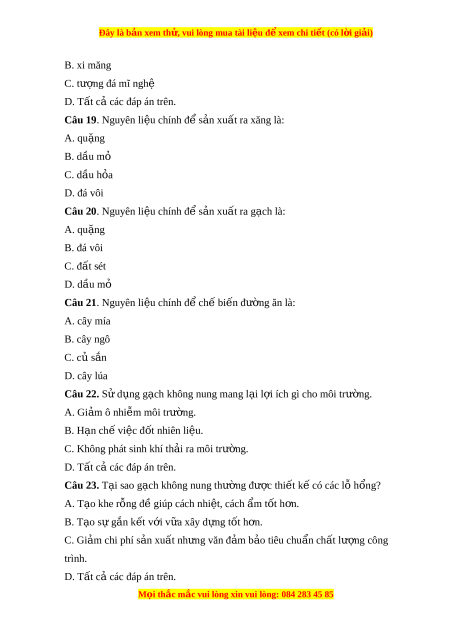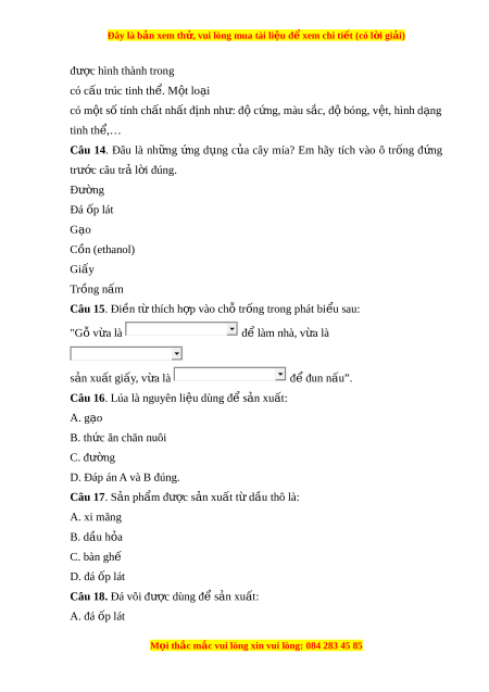 Câu 16. Lúa là nguyên li u dùng đ ệ ể s n ả xu t ấ : A. g o ạ B. th c ứ ăn chăn nuôi C. đư ng ờ D. Đáp án A và B đúng. Câu 17. S n ph ả ẩm đư c s ợ n xu ả t ấ t d ừ u t ầ hô là: A. xi măng B. dầu h a ỏ C. bàn ghế D. đá ốp lát