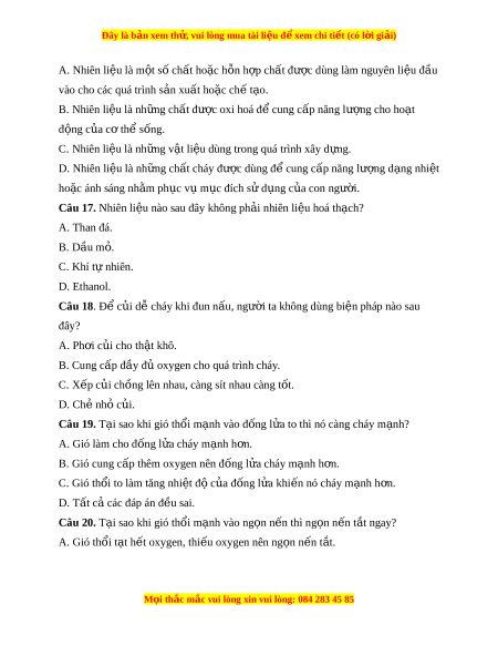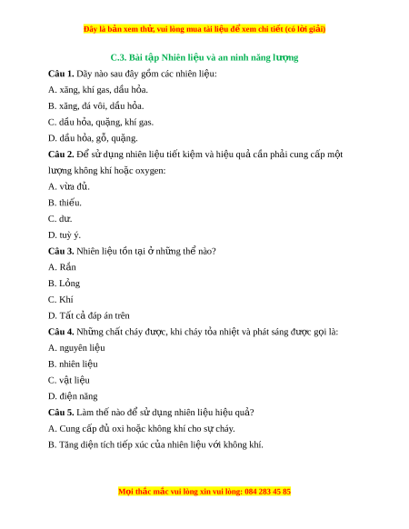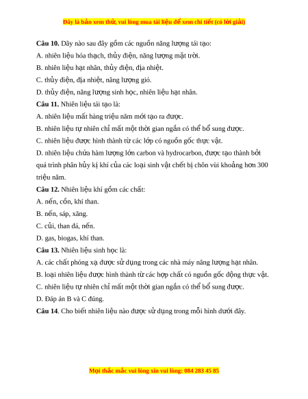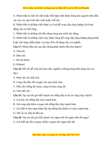 Đây là bản xem th , vu ử i lòng mua tài li u ệ đ xe ể m chi ti t (c ế ó l i ờ gi i ả ) C. Đi u ch ề ỉnh lư ng nhi ợ ên li u đ ệ duy t ể rì s cháy ự m ở c đ ứ c ộ n t ầ hi t ế phù h p ợ v i ớ nhu cầu s d ử ng. ụ D. C ba ý t ả rên đ u đúng. ề Câu 6. Nh n ậ đ nh nào s ị au đây là sai? A. Nhiên li u l ệ à nh ng ch ữ t ấ cháy đư c, khi ợ cháy t a ỏ nhi t ệ và phát sáng. B. Nhiên li u đóng vai ệ trò quan tr ng t ọ rong đ i ờ s ng và s ố n xu ả t ấ . C. Nhiên li u r ệ n g ắ ồm than m , ỏ c i ủ … D. Nhiên li u khí ệ có năng su t ấ t a nhi ỏ t ệ th p, gây đ ấ c ộ h i ạ cho môi trư ng. ờ Câu 7. Nhiên li u l ệ ng ch ỏ ủ y u đ ế ư c dùng cho: ợ A. đ ng ộ c đ ơ ốt trong, m t ộ ph n nh ầ đ ỏ đun n ể u, t ấ h p s ắ áng. B. xây d ng và s ự n xu ả ất giấy. C. nấu nư ng và s ớ ư i ở ấm. D. nghiên c u ứ khoa h c. ọ