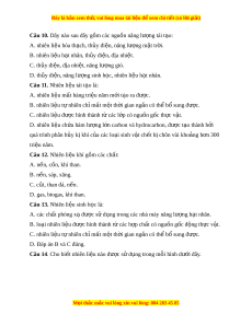 Câu 10. Dãy nào sau đây gồm các ngu n năng l ồ ư ng ợ tái t o: ạ A. nhiên li u hóa t ệ h ch, ạ th y đi ủ n, năng l ệ ư ng m ợ t ặ tr i ờ . B. nhiên li u h ệ t ạ nhân, th y đi ủ n, đ ệ a nhi ị t ệ . C. th y đi ủ ện, địa nhi t ệ , năng lư ng ợ gió. D. th y đi ủ ện, năng lư ng ợ sinh h c, nhi ọ ên li u h ệ t ạ nhân. Câu 11. Nhiên li u t ệ ái t o l ạ à: A. nhiên li u m ệ ất hàng tri u năm ệ m i ớ t o ạ ra đư c. ợ B. nhiên li u t ệ nhi ự ên ch m ỉ t ấ m t ộ th i ờ gian ng n ắ có th b ể s ổ ung đư c. ợ C. nhiên li u đ ệ ư c hì ợ nh thành t các ừ l p có ngu ớ n g ồ c ố th c ự v t ậ . D. nhiên li u ch ệ a ứ hàm lư ng l ợ n car ớ bon và hydrocarbon, đư c t ợ o ạ thành b i ở quá trình phân h y k ủ khí ị c a các ủ lo i ạ sinh v t ậ ch t ế b chôn vùi ị kho ng ả h n 300 ơ tri u năm ệ .