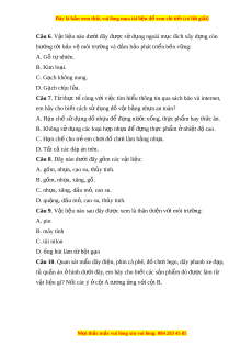 ể hông tin qua sách báo và internet, em hãy cho bi t ế cách s d ử ng ụ đồ v t ậ b ng nh ằ a an ự toàn? A. H n ch ạ ế s d ử ng ụ đồ nh a ự đ đ ể ng n ự ư c u ớ ng, t ố h c ph ự m ẩ hay th c ăn. ứ B. Không s d ử ng các ụ lo i ạ h p nh ợ a ự đ đ ể ng t ự h c ph ự m ẩ nhi ở t ệ đ cao. ộ C. H n ạ ch cho t ế r em ẻ ch i ơ đ ch ồ i ơ làm b ng ằ nh a. ự D. T t ấ c các ả đáp án trên. Câu 8. Dãy nào dư i ớ đây gồm các v t ậ li u: ệ A. gốm, nh a, ự cao su, th y ủ tinh. B. gốm, nh a, xăng, g ự ỗ. C. nh a, ự xăng, d u m ầ , cao s ỏ u. D. qu ng, d ặ ầu m , cao ỏ su, th y t ủ inh. Câu 9. V t ậ li u nào ệ