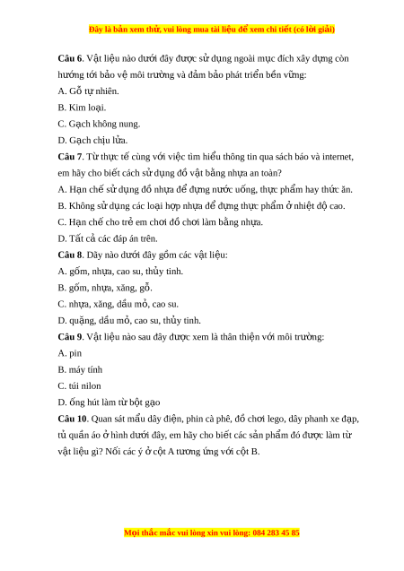 Đây là bản xem th , vu ử i lòng mua tài li u ệ đ xe ể m chi ti t ế (có l i ờ gi i ả ) Câu 6. V t ậ li u nào ệ dư i ớ đây đư c ợ s d ử ng ụ ngoài m c đí ụ ch xây d ng còn ự hư ng t ớ i ớ b o ả v m ệ ôi trư ng và ờ đ m ả b o phát ả tri n b ể n v ề ng: ữ A. Gỗ t nhi ự ên. B. Kim lo i ạ . C. Gạch không nung. D. G ch ạ ch u l ị a. ử Câu 7. T t ừ h c t ự cùng v ế i ớ việc tìm hi u t