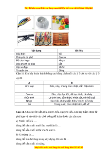 D. muôi nhôm, chìa khóa, g u bông. ấ Câu 4. V t ậ li u g ệ có nh ỗ ng t ữ ính ch t ấ nào sau đây: A. m m ề dẻo, dẫn đi n, t ệ rong su t ố . B. b n, d ề ễ t o hì ạ nh, d cháy ễ . C. c ng, ứ d u ễ ốn, dẫn nhi t ệ . D. đàn hồi, d u ễ ốn, dễ cháy. Câu 5. Đ l ể àm dây dẫn đi n, ng ệ ư i ờ ra s d ử ng ụ kim lo i ạ đ ng. ồ Vì: A. kim lo i ạ đồng d n đi ẫ n t ệ ốt. B. kim lo i ạ đồng d o, d ẻ u ễ ốn. C. kim lo i ạ đồng d n nhi ẫ t ệ t t ố . D. kim lo i ạ đồng ít b ăn m ị òn. M i