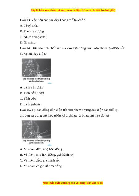 Đây là bản xem th , vu ử i lòng mua tài li u ệ đ xe ể m chi ti t ế (có l i ờ gi i ả ) Câu 13. V t ậ li u nào s ệ au đây không th t ể ái ch ? ế A. Thu t ỷ inh. B. Thép xây d ng. ự C. Nh a ự composite. D. Xi măng. Câu 14. D a vào t ự ính ch t ấ nào mà kim lo i ạ đ ng, ki ồ m lo i ạ nhôm l i ạ đư c s ợ ử d ng l ụ àm dây đi n? ệ A. Tính dẫn đi n ệ B. Tính d n nhi ẫ t ệ C. Tính d o ẻ D. Tính ánh kim Câu 15. T i ạ sao đồng dẫn đi n t ệ ốt h n nhôm ơ nh ng dây ư đi n cao ệ th l ế i ạ thư ng s ờ ử d ng v ụ t ậ li u nhôm ệ ch không s ứ ử d ng v ụ t ậ li u đ ệ ng? ồ A. Vì nhôm d o, nh ẻ h ẹ n ơ đ ng. ồ B. Vì nhôm nh h ẹ n đ ơ ồng, giá thành r . ẻ C. Vì nhôm d o, gi ẻ á thành r . ẻ D. Vì nhôm có giá r h ẻ n ơ đ ng. ồ M i