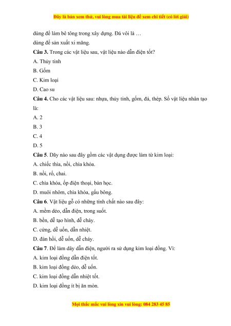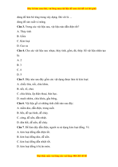 Câu 4. Cho các vật liệu sau: nhựa, thủy tinh, gốm, đá, thép. Số vật liệu nhân tạo là: A. 2 B. 3 C. 4 D. 5