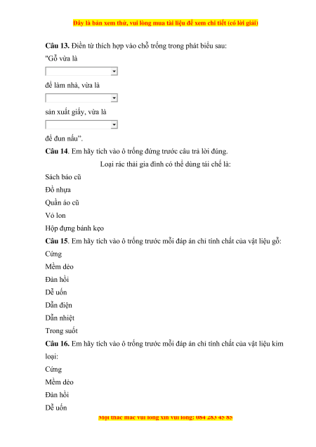 Câu 15. Em hãy tích vào ô trống trước mỗi đáp án chỉ tính chất của vật liệu gỗ: Cứng Mềm dẻo Đàn hồi Dễ uốn Dẫn điện Dẫn nhiệt Trong suốt