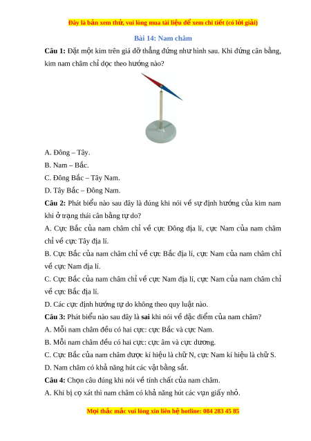 Đây là bản xem th , vu ử i lòng mua tài li u ệ đ xe ể m chi ti t ế (có l i ờ gi i ả ) Bài 14: Nam châm Câu 1: Đ t ặ m t ộ kim trên giá đ ỡ th ng ẳ đ ng ứ nh ư hình sau. Khi đ ng ứ cân b ng, ằ kim nam châm ch d ỉ c t ọ heo hư ng ớ nào? A. Đông – Tây. B. Nam – B c ắ . C. Đông B c – ắ Tây Nam. D. Tây Bắc – Đông Nam. Câu 2: Phát bi u