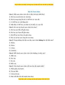 Nam châm không hút: đ ng, nhôm ồ ,… Câu 4: Đáp án đúng là: B Mỗi nam châm vĩnh c u có ử hai c c l ự à: c c ự b c và ắ c c nam ự . Câu 5: Đáp án đúng là: C
