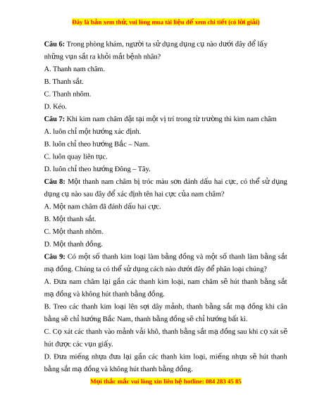 Đây là bản xem th , vu ử i lòng mua tài li u ệ đ xe ể m chi ti t (c ế ó l i ờ gi i ả ) Bài 18: Nam châm Câu 1: M t ộ nam châm vĩnh c u ử có đ c t ặ ính nào dư i ớ đây? A. Khi b c ị xát ọ thì hút các v t ậ nh . ẹ B. Khi b nung nóng l ị ên thì có th hút ể các v n s ụ t ắ . C. Có th hút ể các v t ậ b ng s ằ t ắ . D. M t ộ đ u có t ầ hể hút, còn đ u ki ầ a thì đ y các ẩ v n s ụ t ắ .