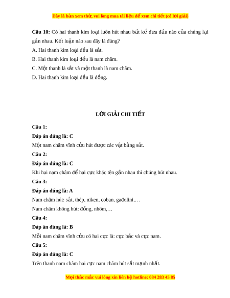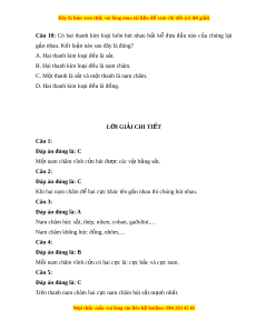 Câu 10: Có hai thanh kim lo i ạ luôn hút nhau b t ấ kể đ a ư đ u ầ nào c a ủ chúng l i ạ gần nhau. K t ế lu n nào s ậ au đây là đúng? A. Hai thanh kim lo i ạ đ u l ề à s t ắ . B. Hai thanh kim lo i ạ đ u l ề à nam châm. C. M t ộ thanh là s t ắ và m t ộ thanh là nam châm. D. Hai thanh kim lo i ạ đ u l ề à đ ng. ồ LỜI GIẢI CHI TI T Ế Câu 1: Đáp án đúng là: C M t ộ nam châm vĩnh c u hút ử đư c ợ các v t ậ b ng ằ s t ắ . Câu 2: Đáp án đúng là: C Khi hai nam châm đ hai ể c c ự khác tên g n nhau t ầ hì chúng hút nhau. Câu 3: Đáp án đúng là: A Nam châm hút: s t