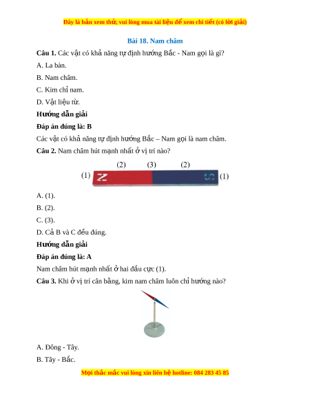 Đây là bản xem th , vu ử i lòng mua tài li u ệ đ xe ể m chi ti t (c ế ó l i ờ gi i ả ) Bài 18. Nam châm Câu 1. Các v t ậ có kh năng t ả đ ự nh h ị ư ng ớ B c ắ - Nam g i ọ là gì? A. La bàn. B. Nam châm. C. Kim ch nam ỉ . D. V t ậ li u t ệ . ừ Hư ng d ớ ẫn gi i ả Đáp án đúng là: B Các v t ậ có kh năng t ả đ ự nh h ị ư ng ớ B c ắ – Nam g i ọ là nam châm.