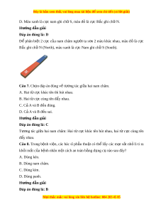 chữ N (North), màu xanh là c c N ự am ghi ch S ( ữ South). Câu 7. Ch n ọ đáp án đúng v t ề ư ng ơ tác gi a hai ữ nam châm. A. Hai t c ừ c khác t ự ên thì hút nhau. B. Hai t c ừ c cùng ự tên đ y nhau. ẩ C. Cả A và B đ u đúng. ề D. C ả A và B đ u s ề ai. Hư ng d ớ ẫn gi i ả Đáp án đúng là: C Tư ng ơ tác gi a ữ hai nam châm: Hai t ừ c c