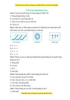 B. Giá thành và chi phí l p đ ắ t ặ cao C. Vẫn còn rác th i ả là các pin m t ặ tr i ờ D. Cả B và C. Câu 2: S p ắ x p các đ ế ối tư ng t ợ rong hình v d ẽ ư i ớ đây theo đúng th t ứ đ ự ể thấy được cách s n ả xu t ấ đi n b ệ ng pi ằ n m t ặ tr i ờ . A. b – a – c B. a – b – c C. b – c – a D. a – c – b Câu 3: D ng ụ c nào s ụ au đây ho t ạ đ ng ộ b ng năng l ằ ư ng ợ l y t ấ ngu ừ n năng ồ lư ng t ợ ái t o? ạ A. Bóng điện B. Xe máy C. Ô tô D. Đèn dầu Câu 4: Năng lư ng đ ợ a nhi ị t ệ là năng lư ng t ợ hu đư c ợ t : ừ A. s c