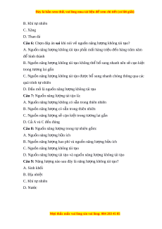 ế phun, suối nư c nóng, khu v ớ c ự g n núi ầ l a, ử …). Đáp án cần ch n ọ là: A Câu 5: Các nguồn năng lư ng ợ tái t o bao g ạ m ồ : năng lư ng t ợ M ừ t ặ Tr i ờ , năng lư ng ợ gió, năng lư ng n ợ ư c, ớ năng lư ng s ợ inh kh i ố , … Đáp án cần ch n ọ là: A M i