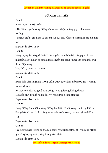 Đây là bản xem th , vu ử i lòng mua tài li u ệ đ xe ể m chi ti t ế (có l i ờ gi i ả ) L I Ờ GIẢI CHI TI T Ế Câu 1: Năng lư ng t ợ M ừ t ặ Tr i ờ : - Ưu đi m ể : nguồn năng lư ng s ợ n có ẵ