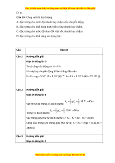 F = P = mg = 5.103.10 = 5.104 (N) A = F.h = 5.104.1440 = 72.106 (J). Câu 2 Hướng dẫn giải Đáp án đúng là: B 1 2 1 2 h gt .10.3 45 m 3 3