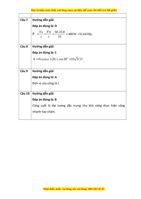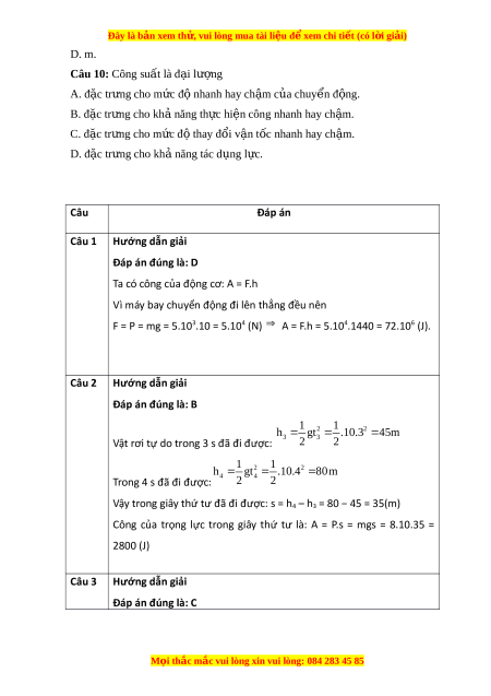 Đây là bản xem th , vu ử i lòng mua tài li u ệ đ xe ể m chi ti t ế (có l i ờ gi i ả ) D. m. Câu 10: Công su t ấ là đ i ạ lư ng ợ A. đ c ặ tr ng cho m ư c ứ đ nhanh hay ch ộ m ậ c a chuy ủ n ể đ ng. ộ B. đ c ặ tr ng ư cho kh năng t ả h c ự hi n công ệ nhanh hay ch m ậ . C. đ c ặ tr ng ư cho m c đ ứ t ộ hay đ i ổ v n t ậ c nhanh hay ch ố m ậ . D. đ c ặ tr ng cho kh ư ả năng tác d ng l ụ c. ự Câu Đáp án Câu 1 Hướng dẫn giải Đáp án đúng là: D
