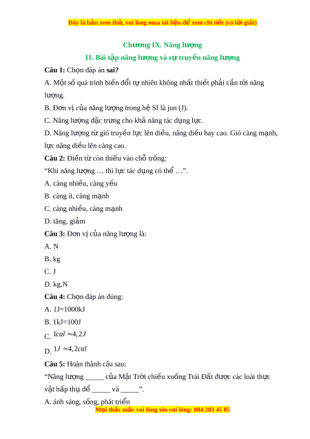 Đây là bản xem th , vu ử i lòng mua tài li u ệ đ xe ể m chi ti t ế (có l i ờ gi i ả ) Chư ng I ơ X. Năng lư ng ợ I1. Bài t p năng l ậ ư ng và s ợ t ự ruy n n ề ăng lư ng ợ Câu 1: Ch n ọ đáp án sai? A. M t ộ số quá trình bi n đ ế ổi t nhi ự ên không nh t ấ thi t ế ph i ả c n t ầ i ớ năng lư ng. ợ B. Đ n ơ v c ị a ủ năng lư ng t ợ rong h S ệ I là jun (J). C. Năng lư ng đ ợ c ặ tr ng cho kh ư ả năng tác d ng l ụ c. ự D. Năng lư ng t ợ gi ừ ó truy n l ề c l ự ên di u, nâng ề di u bay cao. G ề ió càng m nh, ạ l c nâng di ự u l ề ên càng cao. Câu 2: Đi n t ề ừ còn thi u vào ch ế ỗ trống: “Khi năng lư ng … t ợ hì l c ự tác d ng có t ụ h …”. ể A. càng nhi u, càng ề y u ế B. càng ít, càng m nh ạ C. càng nhi u, càng m ề nh ạ D. tăng, gi m ả Câu 3: Đ n ơ v c ị a ủ năng lư ng l ợ à: A. N B. kg C. J D. kg.N Câu 4: Ch n ọ đáp án đúng: A. 1J=1000kJ B. 1kJ=100J C. 1cal 4 , 2J D. 1J 4 , 2cal