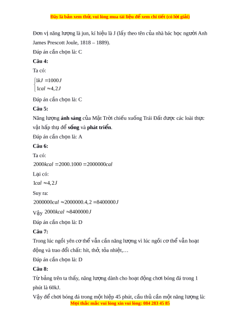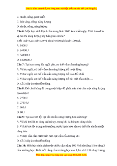 ố và phát tri n ể . Đáp án cần ch n ọ là: A Câu 6: Ta có: 2000kcal 2 000.1000 2 000000cal L i ạ có: 1cal 4 , 2J Suy ra: 2000000cal 2 000000.4, 2 84 00000J V y ậ 2000kcal 8 400000J Đáp án cần ch n ọ là: D Câu 7: Trong lúc ngồi yên c t ơ h v ể n c ẫ n năng l ầ ư ng vì ợ lúc ng i ồ c t ơ h v ể n ho ẫ t ạ đ ng và t ộ rao đ i ổ ch t ấ : hít, th , t ở a ỏ nhi t ệ ,… Đáp án cần ch n ọ là: D Câu 8: T b ừ ng ả trên ta th y ấ , năng lư ng ợ dành cho ho t ạ đ ng ch ộ i ơ bóng đá trong 1 phút là 60kJ. V y đ ậ ể ch i ơ bóng đá trong m t ộ hi p 45 phút ệ , c u t ầ h c ủ n m ầ t ộ năng lư ng ợ là: M i