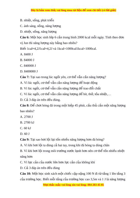 C. ánh sáng, sống, năng lư ng ợ D. nhi t ệ , sống, năng lư ng ợ Câu 6: M t ộ h c s ọ inh l p 6 c ớ n t ầ rung bình 2000 kcal m i ỗ ngày. Tính theo đ n ơ