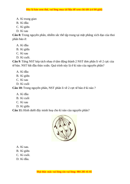 Câu 8: Trong nguyên phân, nhiễm sắc thể tập trung tại mặt phẳng xích đạo của thoi phân bảo ớ: A. Kì đầu B. Ki giữa C. Kì sau D. Kì cuối.