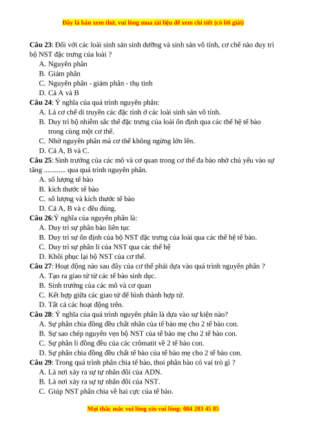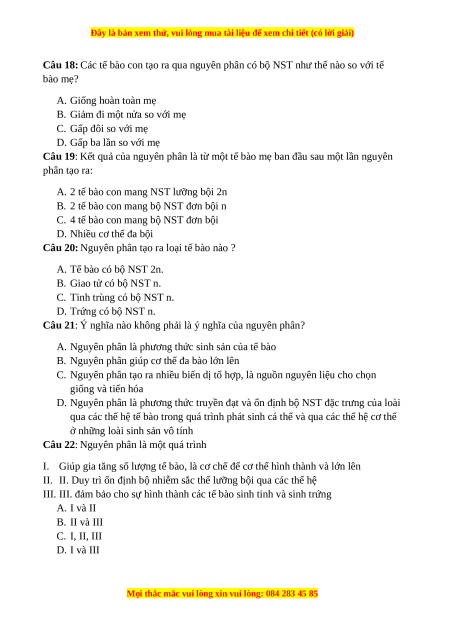 Câu 20: Nguyên phân tạo ra loại tế bào nào ? A. Tế bào có bộ NST 2n. B. Giao tử có bộ NST n. C. Tinh trùng có bộ NST n. D. Trứng có bộ NST n.