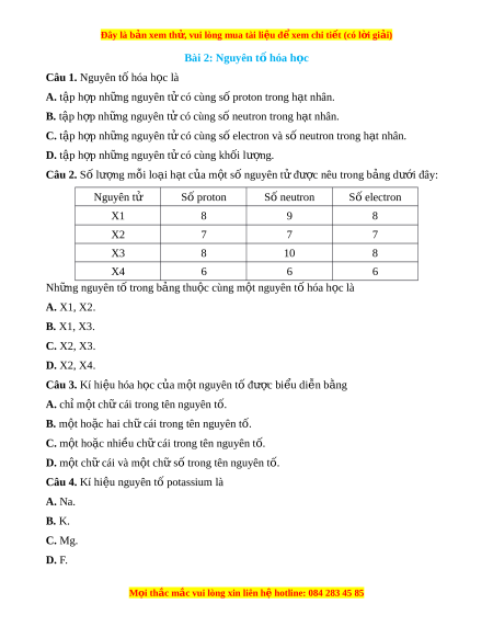 cùng số electron và s neut ố ron trong h t ạ nhân. D. t p ậ h p nh ợ ng nguyên t ữ có ử cùng kh i ố lư ng. ợ Câu 2. Số lư ng m ợ ỗi lo i ạ h t ạ c a ủ m t ộ s nguyên t ố đ ử ư c ợ nêu trong b ng d ả ư i ớ đây: Nguyên tử Số proton Số neutron Số electron X1 8 9 8 X2 7 7 7 X3 8 10 8 X4 6 6 6 Nh ng ữ nguyên tố trong b ng t ả hu c ộ cùng m t ộ nguyên t hóa h ố c l ọ à A. X1, X2. B. X1, X3. C. X2, X3. D. X2, X4. Câu 3. Kí hi u hóa h ệ c ọ c a m ủ t ộ nguyên tố đư c ợ bi u ể di n b ễ ng ằ A. chỉ m t