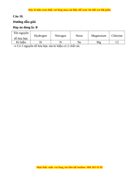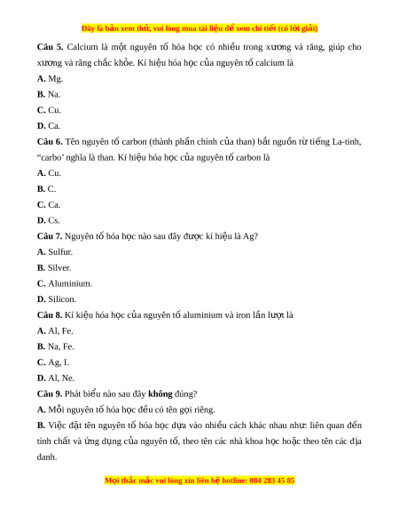 Đây là bản xem th , vu ử i lòng mua tài li u ệ đ xe ể m chi ti t (c ế ó l i ờ gi i ả ) Câu 5. Calcium là m t ộ nguyên tố hóa h c ọ có nhi u ề trong xư ng ơ và răng, giúp cho xư ng ơ và răng ch c kh ắ e. ỏ Kí hi u hóa h ệ c c ọ a ủ nguyên t cal ố cium là A. Mg. B. Na. C. Cu. D. Ca.