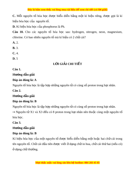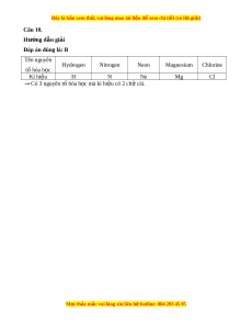 chlorine. Có bao nhiêu nguyên t m ố à kí hi u có 2 ch ệ cái ữ ? A. 2. B. 3. C. 4. D. 5 L I Ờ GIẢI CHI TI T Ế Câu 1. Hư ng d ớ ẫn gi i ả Đáp án đúng là: A Nguyên tố hóa h c ọ là t p h ậ p nh ợ ng ữ nguyên t có cùng s ử pr ố oton trong h t ạ nhân. Câu 2. Hư ng d ớ ẫn gi i ả Đáp án đúng là: B Nguyên tố hóa h c ọ là t p h ậ p nh ợ ng ữ nguyên t có cùng s ử pr ố oton trong h t ạ nhân.