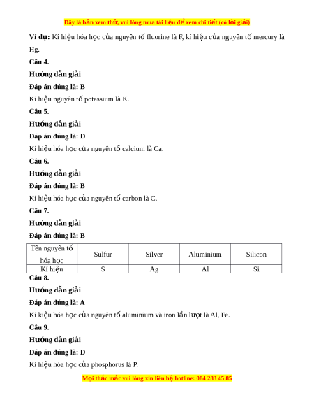 ủ nguyên tố fluorine là F, kí hi u ệ c a ủ nguyên t ố mercury là Hg. Câu 4. Hư ng d ớ ẫn gi i ả Đáp án đúng là: B Kí hi u nguyên t ệ ố potassium là K. Câu 5. Hư ng d ớ ẫn gi i ả Đáp án đúng là: D Kí hi u hóa h ệ c ọ c a nguyên t ủ ố calcium là Ca. Câu 6. Hư ng d ớ ẫn gi i ả Đáp án đúng là: B Kí hi u hóa h ệ c ọ c a nguyên t ủ ố carbon là C. Câu 7. Hư ng d ớ ẫn gi i ả Đáp án đúng là: B Tên nguyên tố Sulfur Silver Aluminium Silicon hóa h c ọ Kí hi u ệ S Ag Al Si Câu 8. Hư ng d ớ ẫn gi i ả Đáp án đúng là: A Kí ki u hóa h ệ c ọ c a nguyên t ủ ố aluminium và iron l n l ầ ư t ợ là Al, Fe. Câu 9. Hư ng d ớ ẫn gi i ả Đáp án đúng là: D Kí hi u hóa h ệ c ọ c a phos ủ phorus là P. M i