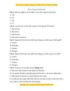 ợ a bao nhiêu nguyên t hóa h ố c? ọ A. 118; B. 119; C. 120; D. 121. Câu 2. Lo i ạ h t ạ nào sau đây đ c ặ tr ng cho ư m t ộ nguyên t hóa ố h c? ọ A. H t ạ neutron; B. H t ạ proton; C. H t ạ electron; D. H t ạ proton và neutron.
