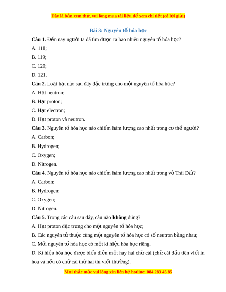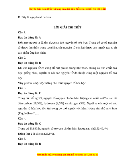 D. Đây là nguyên tố carbon. LỜI GIẢI CHI TI T Ế Câu 1. Đáp án đúng là: A Đ n ế nay ngư i ờ ta đã tìm đư c ợ ra 118 nguyên t ố hóa h c. ọ Trong đó có 98 nguyên tố đư c ợ tìm th y ấ trong t ự nhiên, các nguyên t ố còn l i ạ đư c ợ con ngư i ờ t o ạ ra từ các ph n ả ng h ứ t ạ nhân. Câu 2. Đáp án đúng là: B