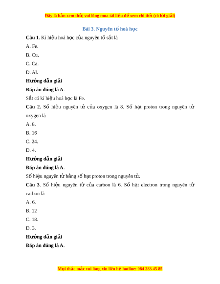 Đây là bản xem th , vu ử i lòng mua tài li u ệ đ xe ể m chi ti t (c ế ó l i ờ gi i ả ) Bài 3. Nguyên t h ố oá h c ọ Câu 1. Kí hi u hoá h ệ c ọ c a nguyên t ủ ố s t ắ là A. Fe. B. Cu. C. Ca. D. Al. Hư ng d ớ ẫn gi i ả