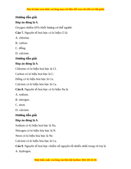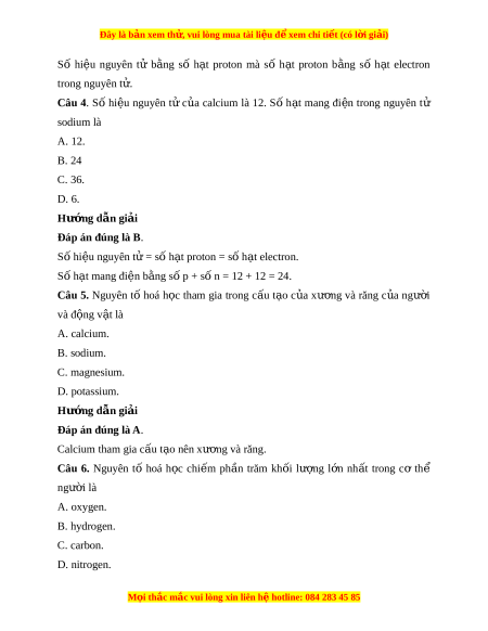 Đây là bản xem th , vu ử i lòng mua tài li u ệ đ xe ể m chi ti t (c ế ó l i ờ gi i ả ) Số hi u ệ nguyên tử b ng ằ số h t ạ proton mà số h t ạ proton b ng ằ số h t ạ electron trong nguyên t . ử Câu 4. Số hi u ệ nguyên tử c a ủ calcium là 12. S ố h t ạ mang đi n ệ trong nguyên tử sodium là A. 12. B. 24 C. 36. D. 6. Hư ng d ớ ẫn gi i ả
