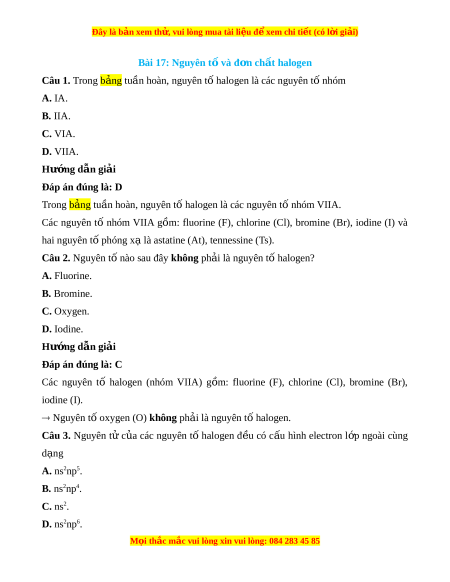 ả tuần hoàn, nguyên tố halogen là các nguyên t nhóm ố A. IA. B. IIA. C. VIA. D. VIIA. Hư ng d ớ ẫn gi i ả Đáp án đúng là: D Trong b ng