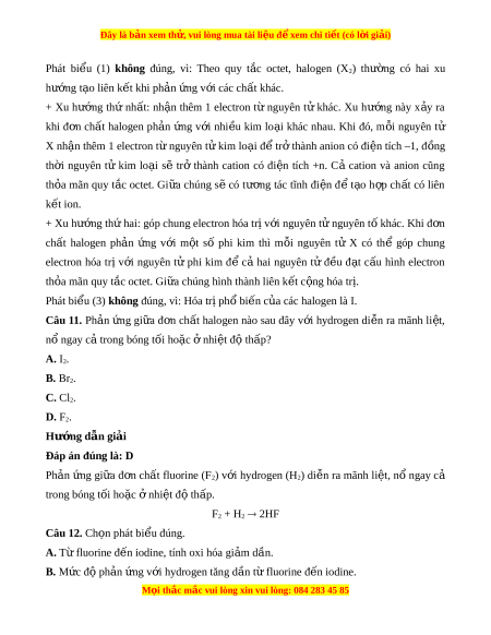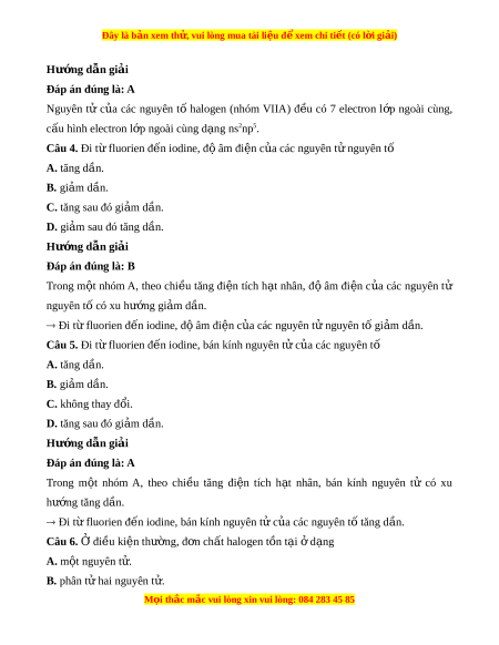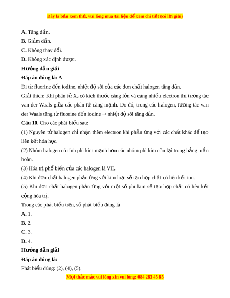 Đây là bản xem th , vu ử i lòng mua tài li u ệ đ xe ể m chi ti t (c ế ó l i ờ gi i ả ) A. Tăng d n. ầ B. Gi m ả dần. C. Không thay đổi. D. Không xác đ nh đ ị ược. Hư ng d ớ ẫn gi i ả Đáp án đúng là: A Đi t f ừ luorine đ n i ế odine, nhi t ệ đ s ộ ôi c a ủ các đ n ch ơ t ấ halogen tăng d n. ầ Gi i ả thích: Khi phân t ử X2 có kích thư c ớ càng l n ớ và càng nhi u ề electron thì tư ng ơ tác van der Waals gi a