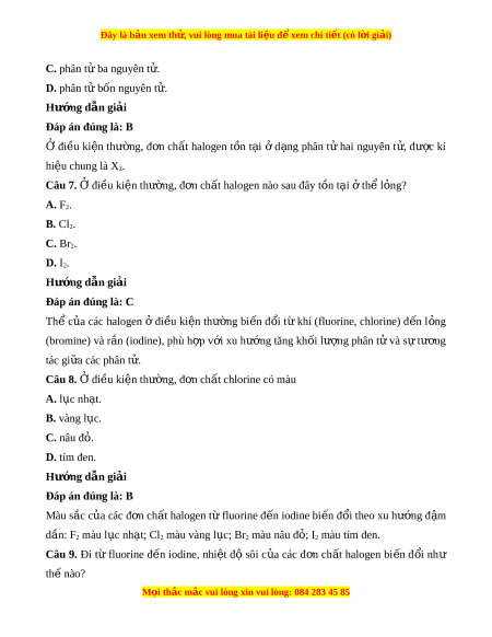 D. phân tử bốn nguyên t . ử Hư ng d ớ ẫn gi i ả Đáp án đúng là: B Ở đi u ề ki n ệ thư ng, ờ đ n ơ ch t ấ halogen t n ồ t i ạ ở d ng ạ phân t ử hai nguyên t , ử đư c ợ kí hiệu chung là X2. Câu 7. Ở đi u ki ề ện thư ng, đ ờ n ch ơ