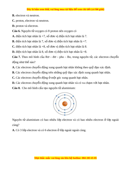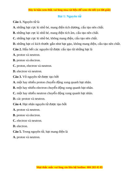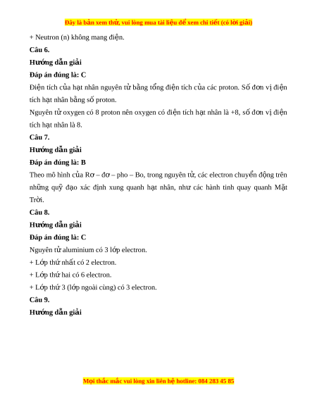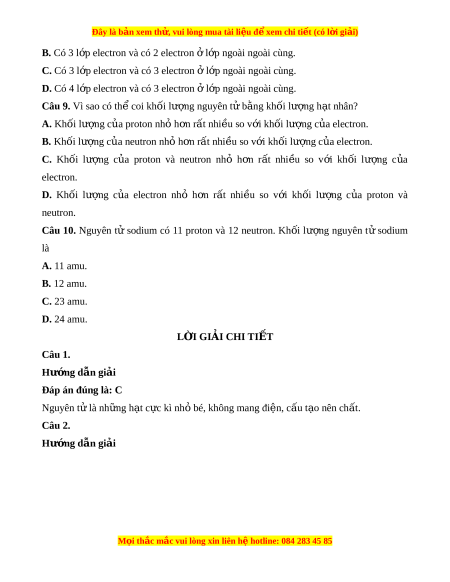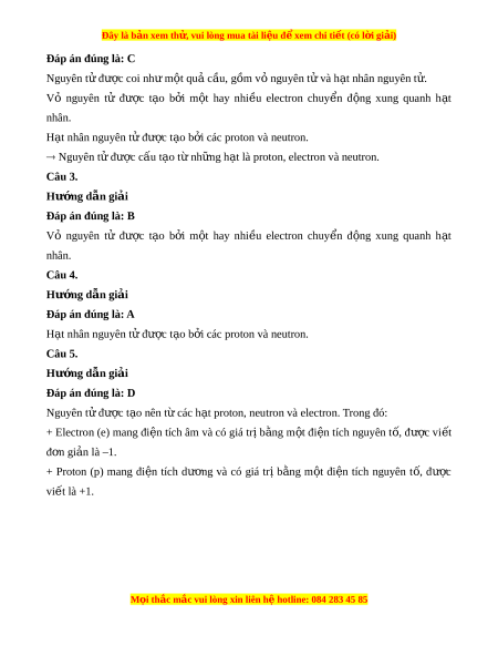 Đây là bản xem th , vu ử i lòng mua tài li u ệ đ xe ể m chi ti t (c ế ó l i ờ gi i ả ) Đáp án đúng là: C Nguyên t đ ử ư c coi ợ nh m ư t ộ qu c ả u, g ầ ồm v nguyên t ỏ và h ử t ạ nhân nguyên t . ử Vỏ nguyên tử đư c ợ t o ạ b i ở m t ộ hay nhi u ề electron chuy n ể đ ng ộ xung quanh h t ạ nhân. H t ạ nhân nguyên t đ ử ư c ợ t o b ạ i ở các proton và neutron. Nguyên t đ ử ư c ợ c u t ấ o t ạ nh ừ ng h ữ t