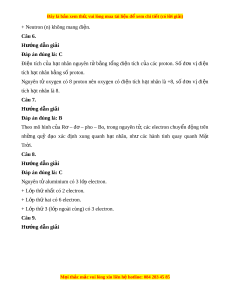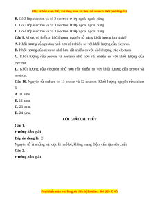 Câu 10. Nguyên tử sodium có 11 proton và 12 neutron. Kh i ố lư ng ợ nguyên t ử sodium là A. 11 amu. B. 12 amu. C. 23 amu. D. 24 amu. L I Ờ GIẢI CHI TI T Ế Câu 1. Hư ng d ớ ẫn gi i ả Đáp án đúng là: C Nguyên t l ử à nh ng h ữ t ạ c c ự kì nh bé, không m ỏ ang đi n, c ệ u t ấ o nên ch ạ t ấ . Câu 2. Hư ng d ớ ẫn gi i ả M i
