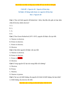 Câu 2. Theo Ernest Rutherford (1871-1937), nguyên t đ ử ư c c ợ u t ấ o ạ b i ở : A. Neutron và electron; B. Proton và electron; C. Proton và electron; D. Electron. Câu 3. H t ạ nhân nguyên t đ ử ư c c ợ u t ấ o ạ b i ở : A. Neutron và electron; B. Proton và electron; C. Proton và neutron; D. Electron.