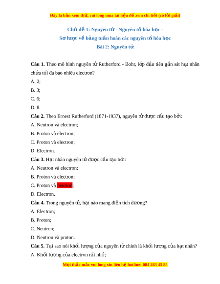 Đây là bản xem th , vu ử i lòng mua tài li u ệ đ xe ể m chi ti t (c ế ó l i ờ gi i ả ) Chủ đ 1: ề Nguyên t - ử Nguyên t hóa h ố c - ọ S l ơ ư c v ợ b