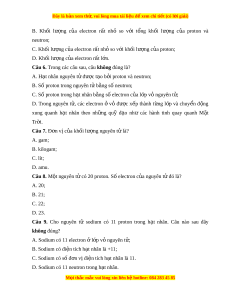 Câu 4. Trong nguyên t , h ử t ạ nào mang đi n t ệ ích dư ng? ơ A. Electron; B. Proton; C. Neutron; D. Neutron và proton. Câu 5. T i ạ sao nói khối lư ng ợ c a nguyên t ủ chí ử nh là kh i ố lư ng ợ c a h ủ t ạ nhân? A. Khối lư ng c ợ a el ủ ectron r t ấ nh ; ỏ M i