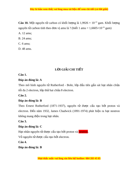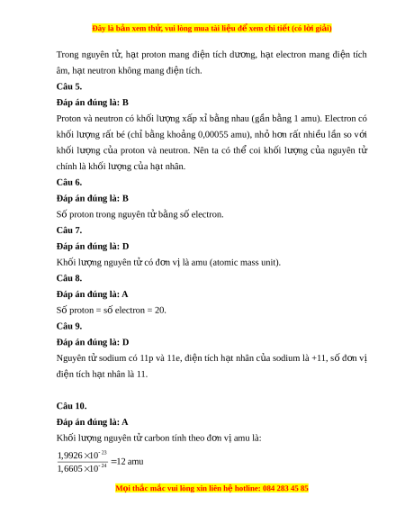 ử sodium có 11p và 11e, đi n ệ tích h t ạ nhân c a ủ sodium là +11, s ố đ n ơ vị điện tích h t ạ nhân là 11. Câu 10. Đáp án đúng là: A Kh i ố lư ng ợ nguyên t car ử bon tính theo đ n v ơ am ị u là: 23 1,9926 10 12 amu 24 1,6605 10 M i